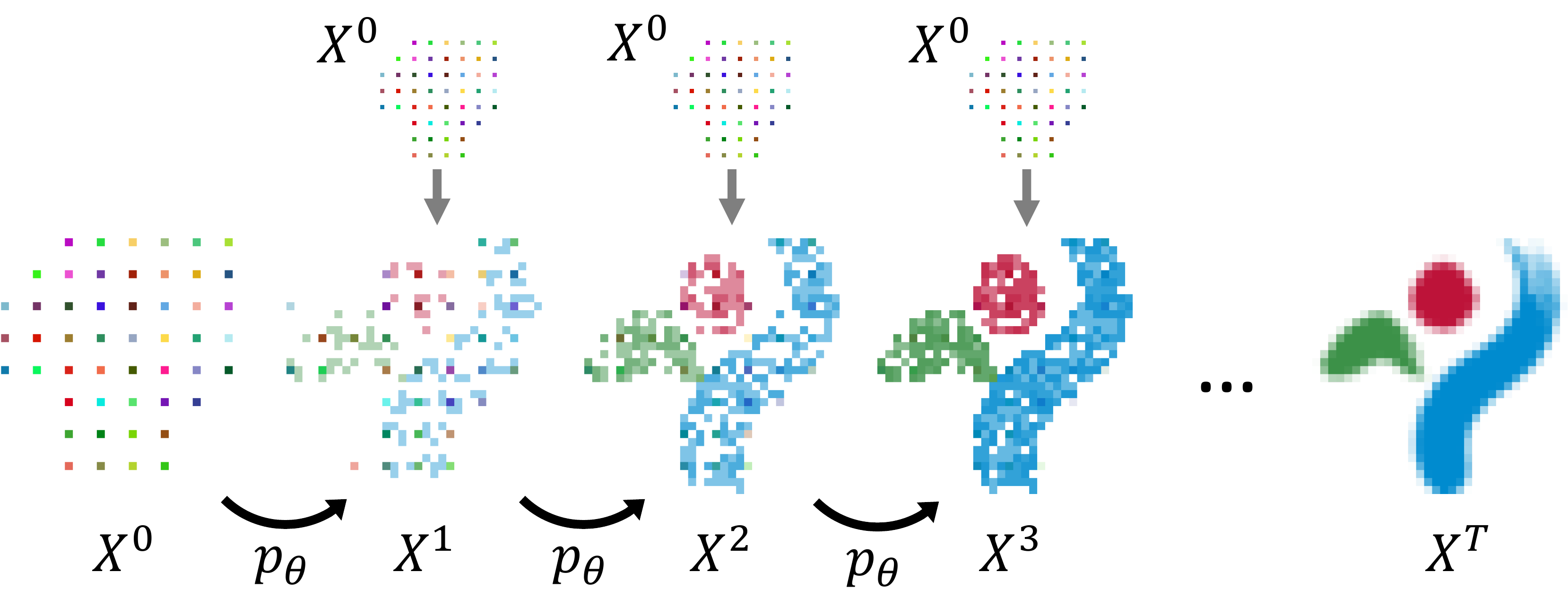 At each time step $t$, GCA samples a new state $X^{t + 1}$ composed of sparse voxel occupancies equipped with features from $p_{\theta}(X^{t+1} | X^t, X^0)$. Recursively applying the transition kernel $p_{\theta}$ to the initial state $X^0$ yields the final generated state $X^T$. We adapt GCA to conditional generation by choosing $X^0$ to be the upsampled coarse set of conditioning voxels and concatenating it to $X^t$ each time $p_\theta$ is applied (gray arrows on the top).