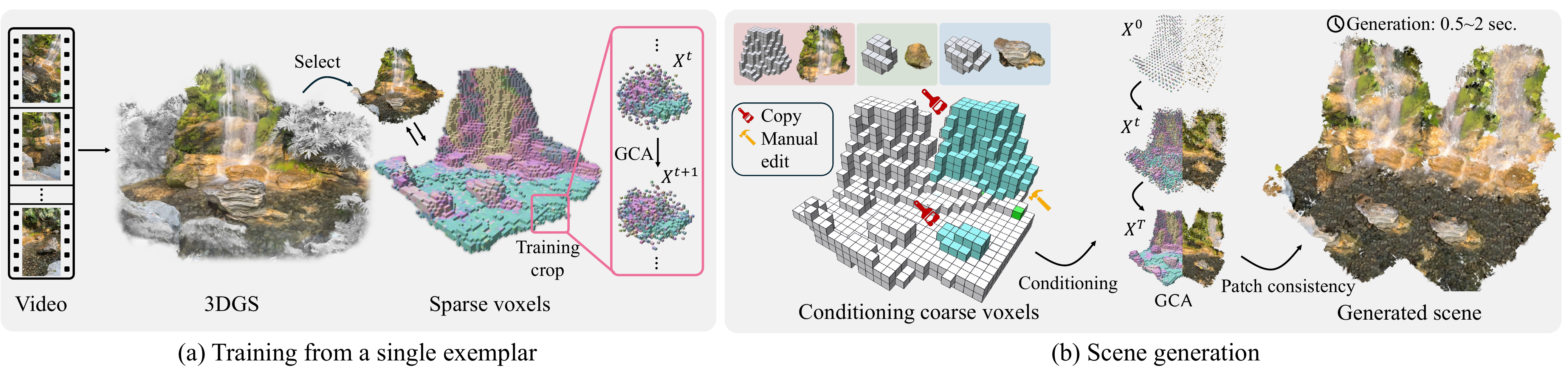 Overview of our pipeline. Training phase. (left) From a casual video, an exemplar scene is reconstructed as 3D Gaussians augmented with DINO features. After selecting the region of interest within an interactive editor, the 3D Gaussians are converted into a sparse volume of voxels. A per-scene Generative Cellular Automaton (GCA) is then efficiently trained on random crops of the scenes in under 10 minutes. Generation phase. (right) A set of coarse conditioning voxels, either copied from parts of the exemplar or manually edited, is provided to the pre-trained GCA. The GCA generates a novel sparse volume of featurized voxels. These voxels are then remapped to the exemplar's 3D Gaussians using a sparse patch-based consistency step.