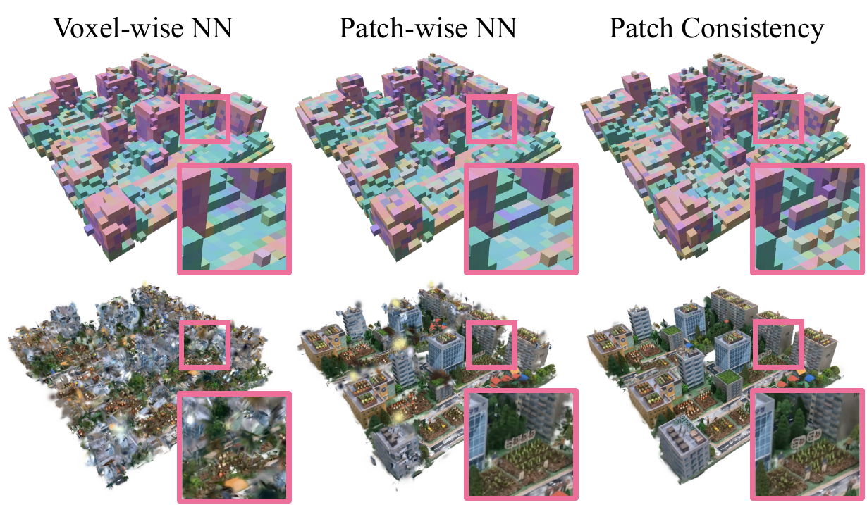 Voxel-wise NN. Naively remapping each predicted voxel to its nearest feature in the exemplar and filling in the corresponding 3D Gaussians fails to produce consistent results due to local consistency and the approximate predictions of GCA. Patch-wise NN. Using the patch-wise distance defined in Equation (3) improves visual coherence but still fails to account for modeling errors. Patch Consistency. We thus propose an additional sparse patch-based consistency operation to refine missing local statistics.
