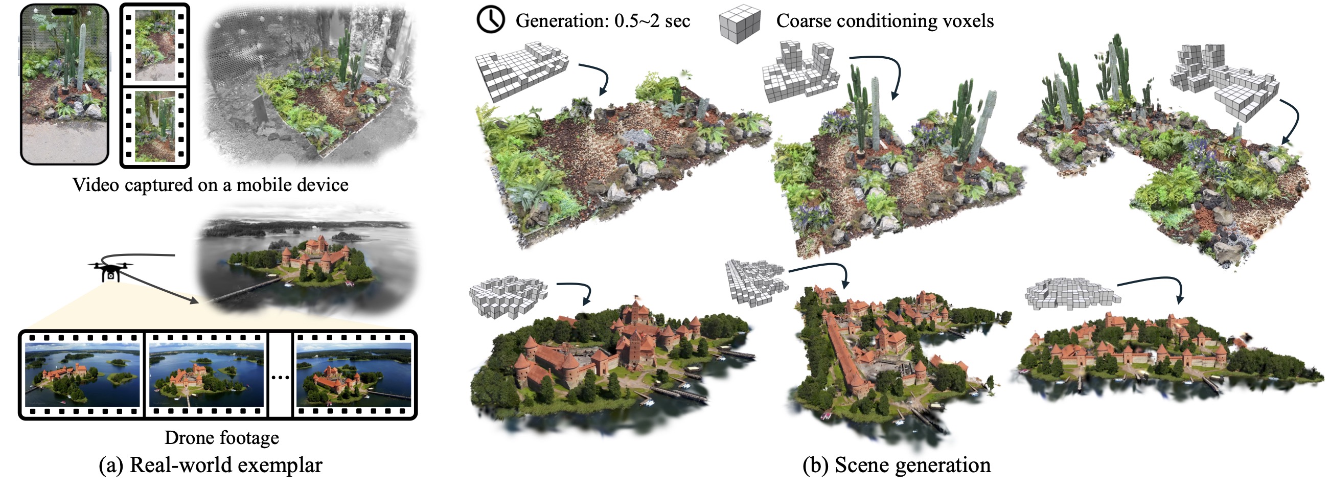 Photorealistic 3D scene generation is challenging due to the scarcity of large-scale, high-quality real-world 3D datasets and complex workflows requiring specialized expertise for manual modeling. These constraints often result in slow iteration cycles, where each modification demands substantial effort, ultimately stifling creativity. We propose a fast, exemplar-driven framework for generating 3D scenes from a single casual input, such as handheld video or drone footage. Our method first leverages 3D Gaussian Splatting (3DGS) to robustly reconstruct input scenes with a high-quality 3D appearance model. We then train a per-scene Generative Cellular Automaton (GCA) to produce a sparse volume of featurized voxels, effectively amortizing scene generation while enabling controllability. A subsequent patch-based remapping step composites the complete scene from the exemplar's initial 3D Gaussian splats, successfully recovering the appearance statistics of the input scene. The entire pipeline can be trained in less than 10 minutes for each exemplar and generates scenes in 0.5-2 seconds. Our method enables interactive creation with full user control, and we showcase complex 3D generation results from real-world exemplars within a self-contained interactive GUI.